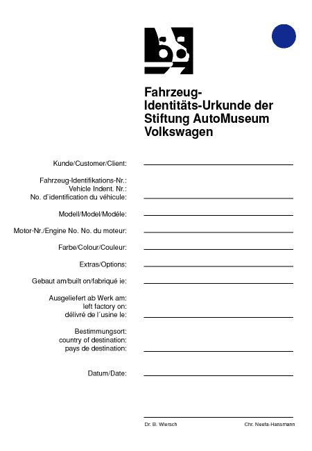 "Don't forget to tell them (a) the chassis number (VIN) of your VW and (b) your own correct name and address. The charge is (as of 1/04) 15 euros, which unfortunately is now $20 US (the dollar's been slipping the past couple of years). [Do not] send an American check due to the high exchange rates the banks charge for checks. (I personally recommend going to your neighborhood bank's International Department and getting 15 euros -- a five and a ten, maybe. That's how I do it.) A twenty dollar [euro] bill would also do the trick."
